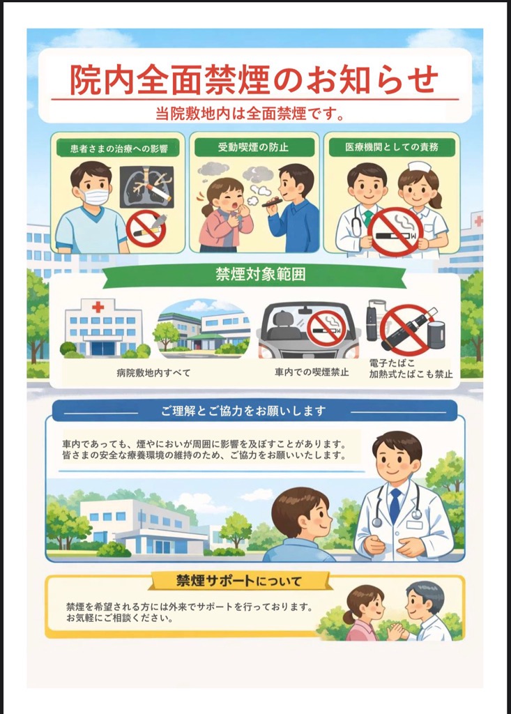 喫煙をされる方にはご不便をおかけいたしますが、医療機関としての使命をご理解いただき、ご協力をお願い申し上げます。